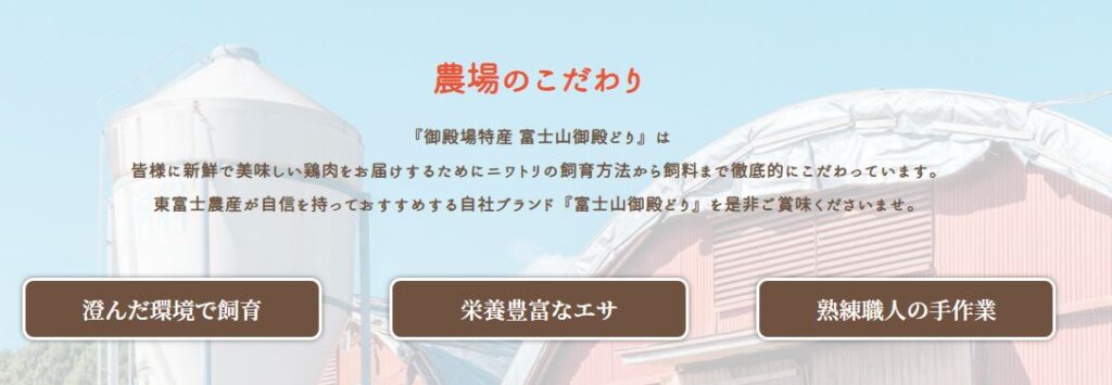 太陽の恵み・独自の飼育技術・御殿場高原の清爽な空気・ミネラル地下水で免疫力を高めた東富士農産の国産銘柄鶏です。